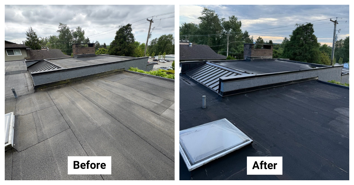 Our team swiftly commenced the project, beginning with meticulous removal and disposal of all existing cap flashing and drains. We thoroughly cleaned and primed the roof surface, correcting ponding issues by building up the two smaller roofs and reinforcing three skylight curbs.