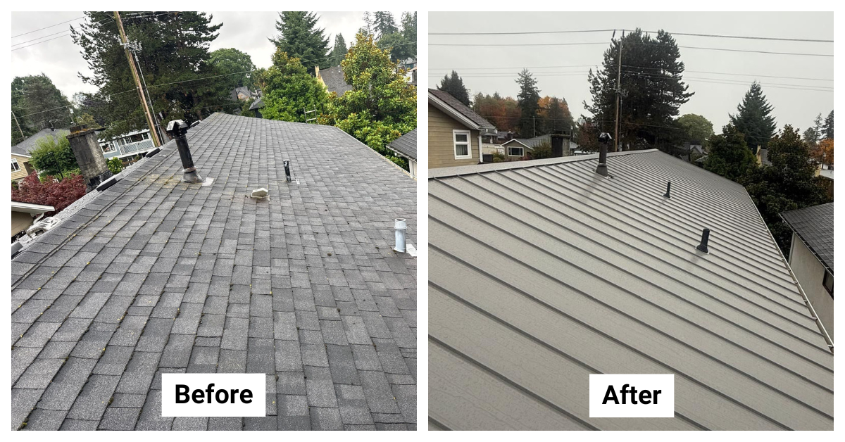 Kim contacted Vantage Roofing to inquire about replacing the existing roofs on their home and detached garage. Both roofs had asphalt shingles, and Kim wanted a long-lasting upgrade. Our team removed the old shingle roofing and installed a new metal roof system using 26ga, 12-inch snap-lock metal panels for a clean, modern finish and strong protection.